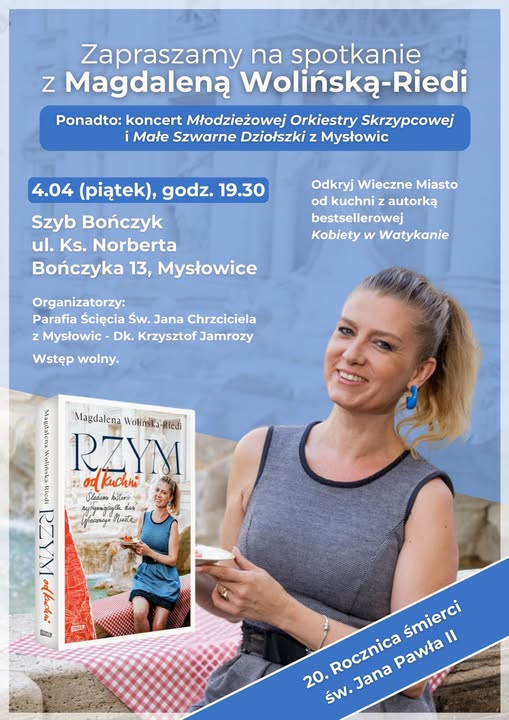 Z okazji zbliżającej się 20. rocznicy śmierci św. Jana Pawła II zapraszamy na wyjątkowe wydarzenie – spotkanie z Magdaleną Wolińską-Riedi, autorką bestsellerowej książki „Kobiety w Watykanie” oraz najnowszej publikacji „Rzym od kuchni”.